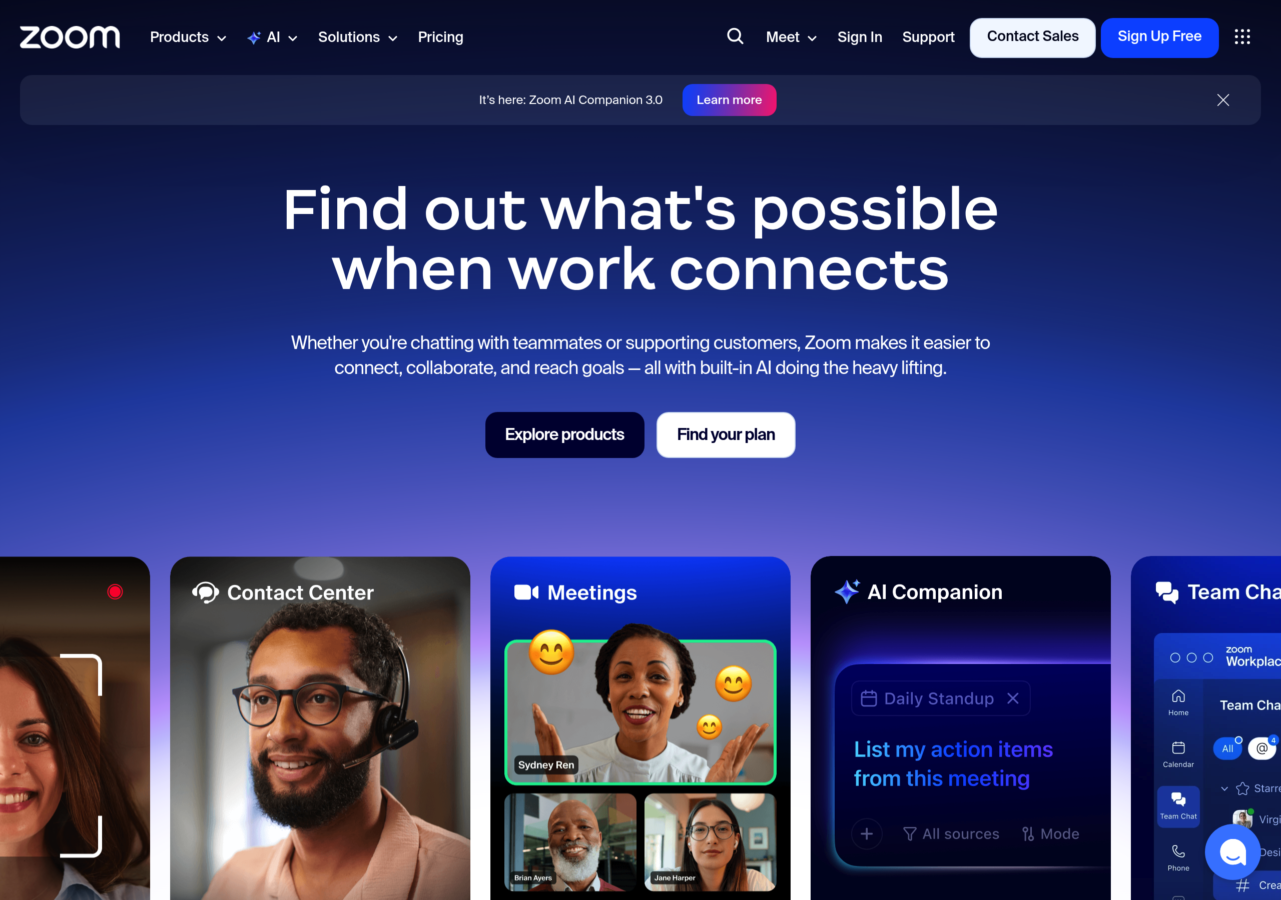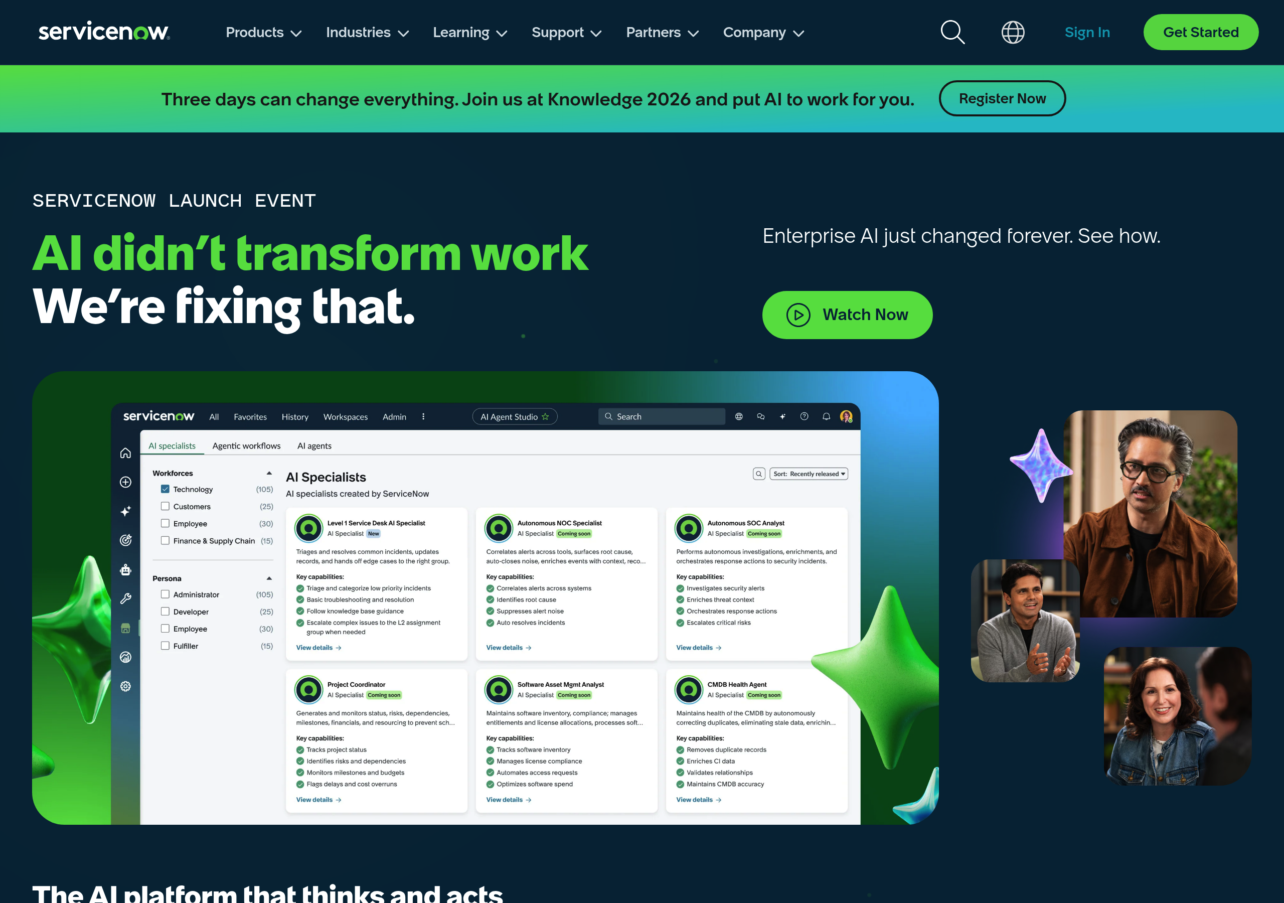 ServiceNowServiceNow’s homepage sells an enterprise transformation outcome (AI-driven workflows across the business) instead of a single feature, which matches how large buyers evaluate platforms.