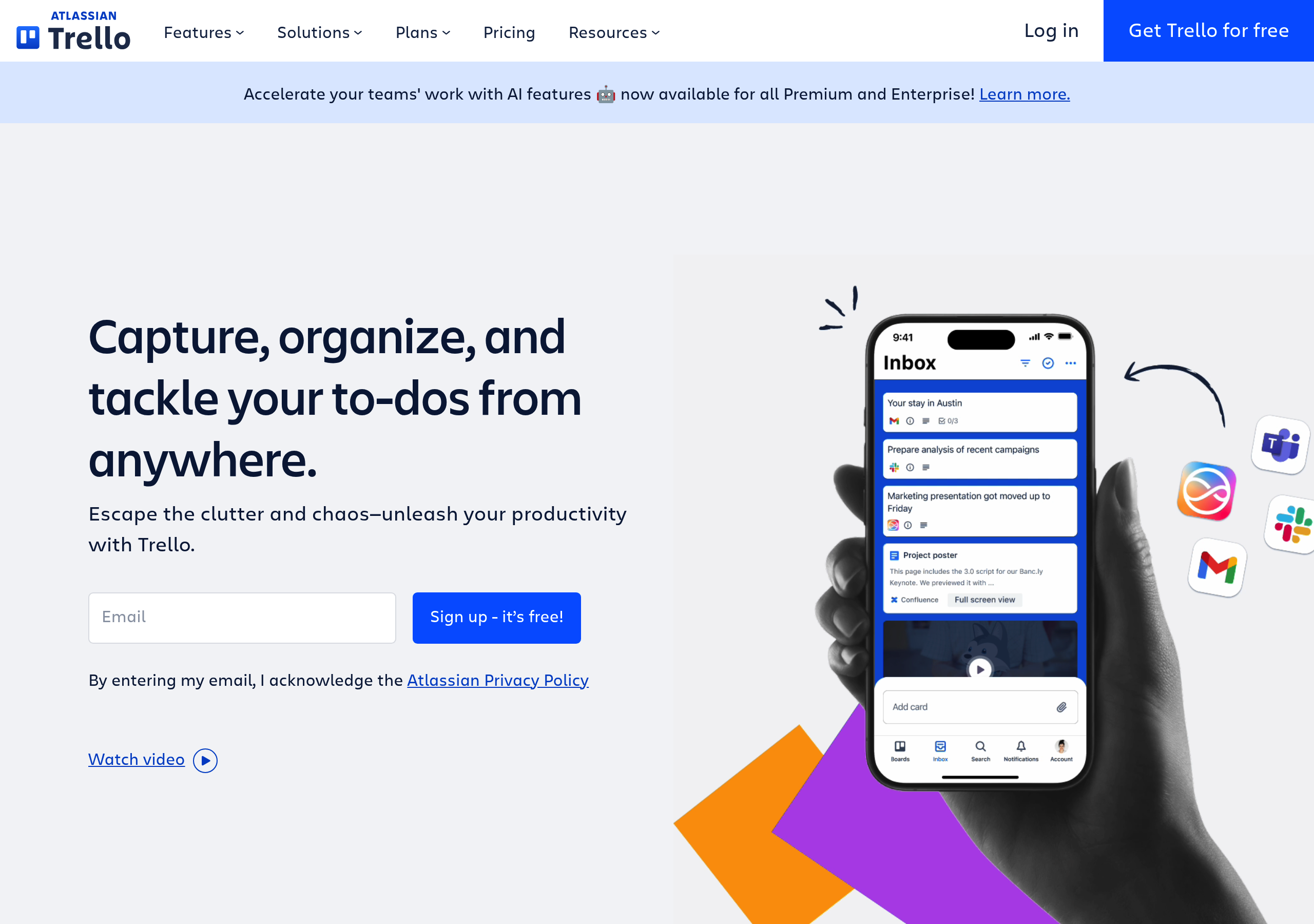 AsanaAsana’s homepage clarifies the category and outcome fast by pairing a single-sentence value prop (“All your work, all in one place”) with dual CTAs (“Get started” and “View demo”) that serve both self-serve and sales-led buyers.