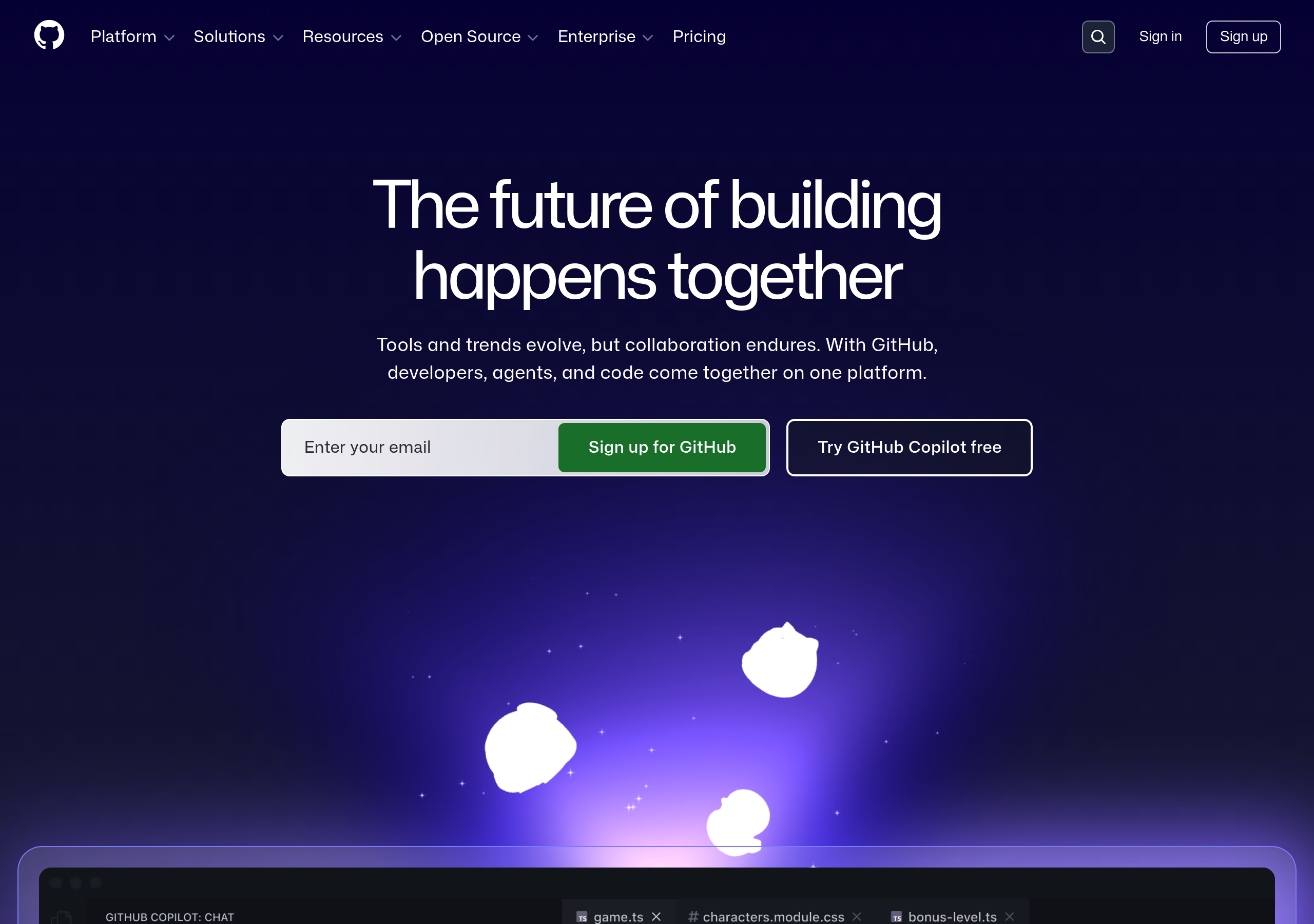 GitHubGitHub’s homepage wins by combining an aspirational platform narrative (“The future of building happens together”) with immediate, product-level CTAs like “Sign up for GitHub” and “Try GitHub Copilot free,” reducing the gap between interest and actio