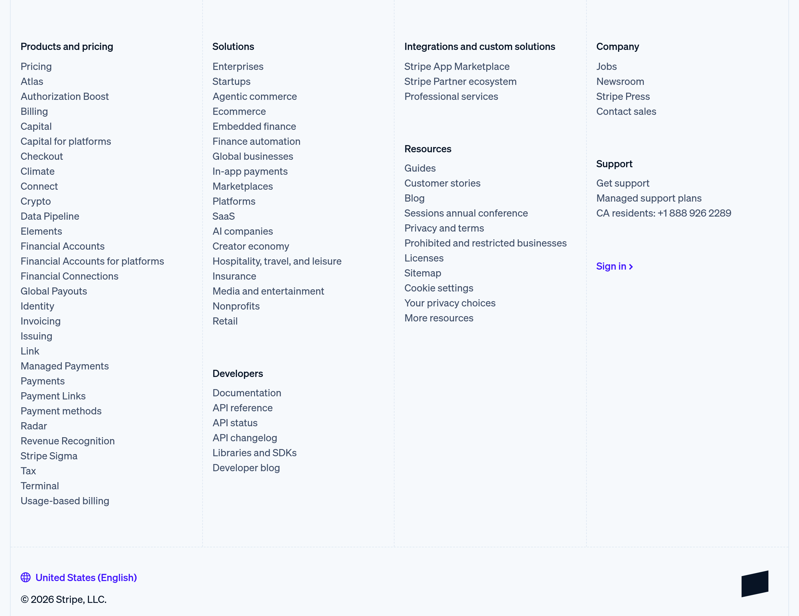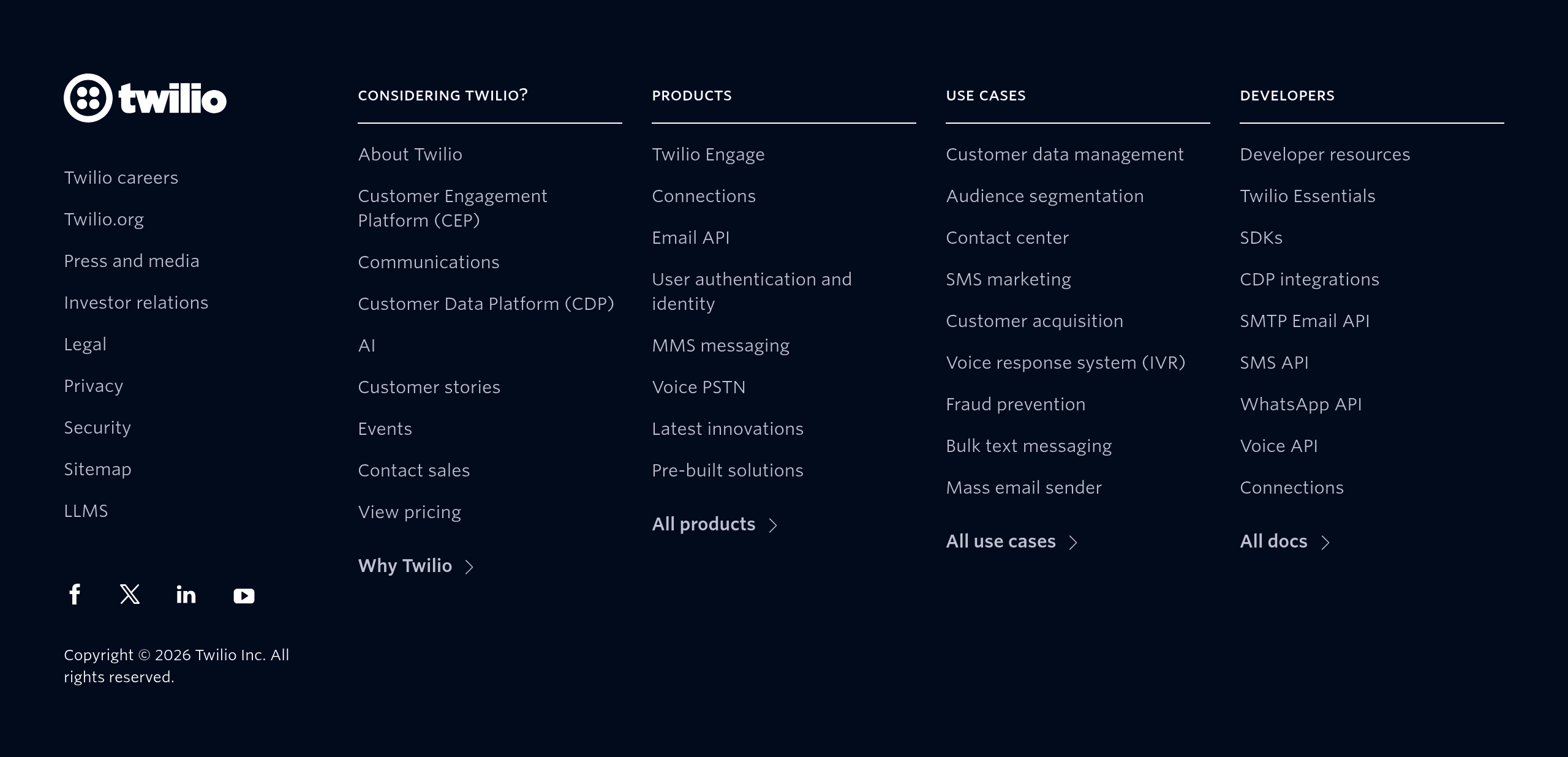 View site →Comprehensive footer with clear sections: Products, Use cases, Developers, Company. Includes trust signals.