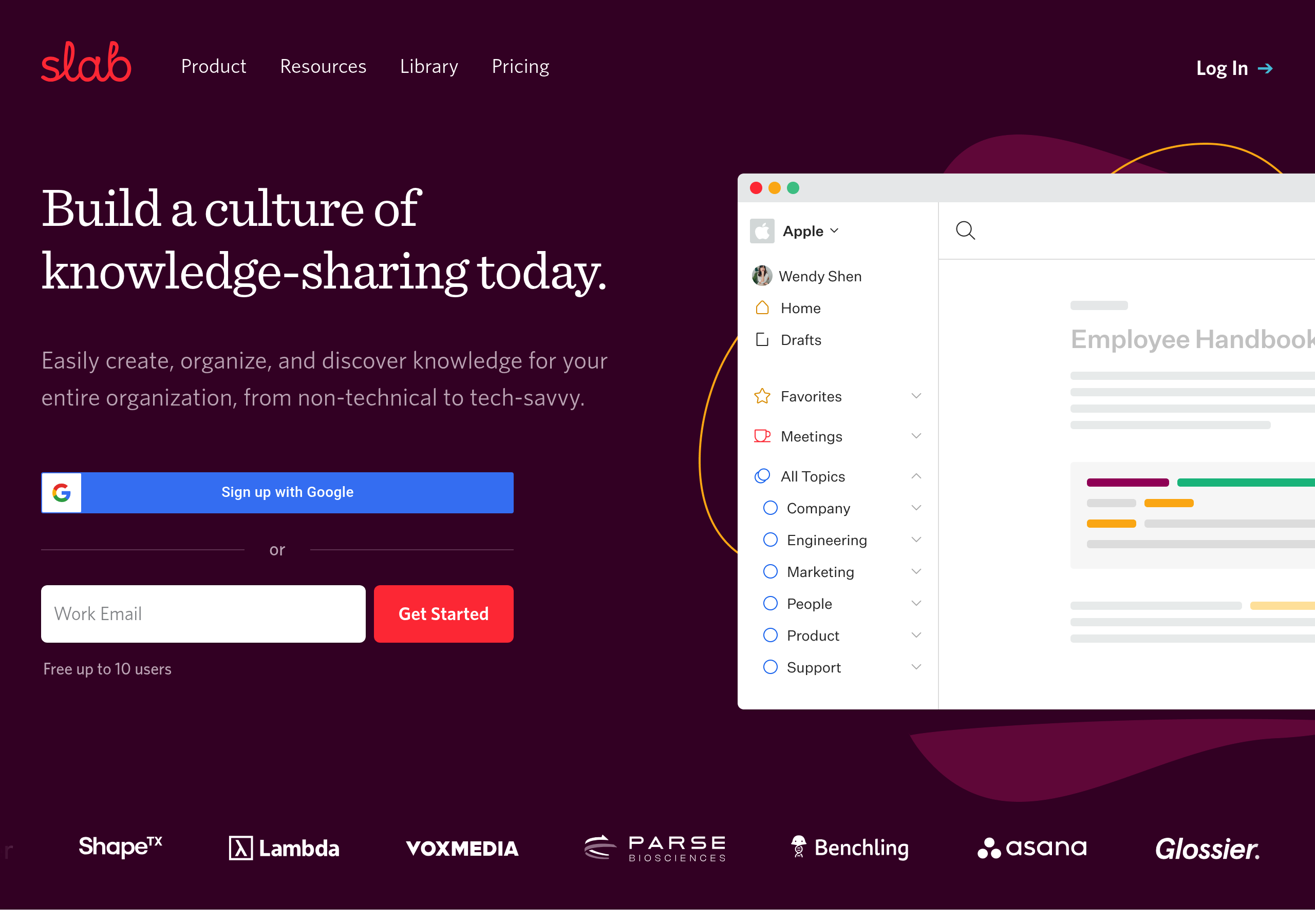 Organized into columns: Product, Company, Resources, Legal. Most common pattern.